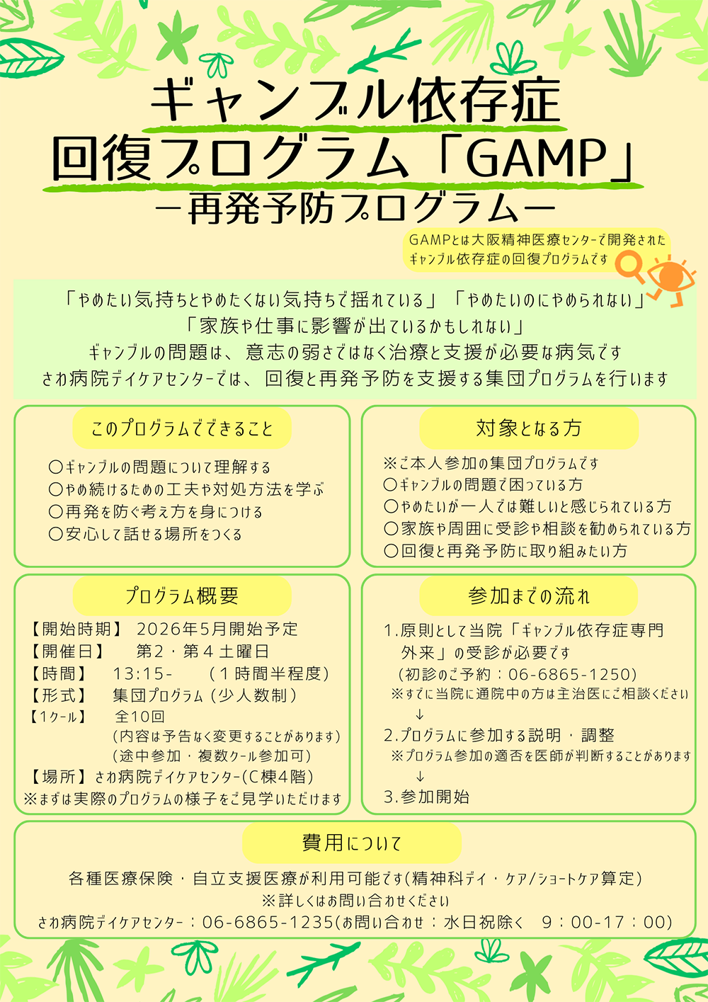| プログラム日程 | 第2・4土曜日 13時15分-1時間半程度 当院精神科デイケアのプログラムの一つとして実施しています。 詳細はデイケアAグループへお問い合わせください。 |